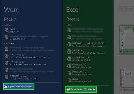 Click Open other documents. It's a link in the lower-left side of the program's window. This will open a list of options on the left side of the window. On a Mac, click the name of your program in the upper-left corner of the screen to prompt a drop-down menu.