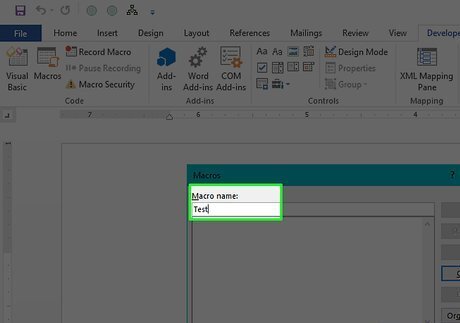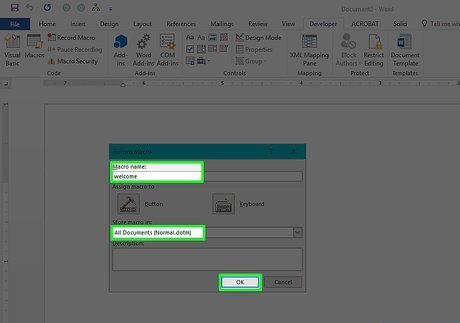 Enter your macro's information. This process will vary slightly depending on your selected program: Word — Enter a name for the macro, select All documents as the "Store macro in" value, and click OK. Excel — Enter a name for the macro, add a keyboard shortcut if you like, select This Workbook as the "Store macro in" value, and click OK.
