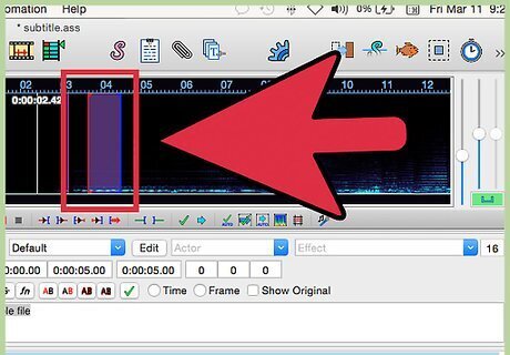Choose where in the video your text will show up. As you might have already seen, there are two frames in the audio window; one is red, and the other blue. The red simply signifies when the text will appear, and the blue signifies where the text will end. Hold the left mouse button down and drag the red frame to the beginning of the waveform; then drag the blue frame to the end of the waveform.