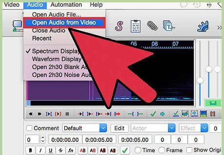 Load the soundtrack from the video. Click on the Audio menu and select Open Audio from Video. This will automatically rip the audio from your video soundtrack and import it into Aegisub. Again, depending on the size and length of your video, this process could take quite a while. After the audio loading process completes, you should see audio waveform display to the upper right of Aegisub.