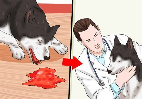 Take the dog to the vet if illness increases. At any time if the dog starts to vomit again or is unable to keep water down it should be brought to a veterinarian’s office. It should also be brought to the veterinarian's office if any of the following signs occur: Increase in frequency or amount of urination Yellow appearance to eye whites, skin or mouth Pale gums along with extreme lethargy Vomiting blood Diarrhea that is very watery or has blood in it