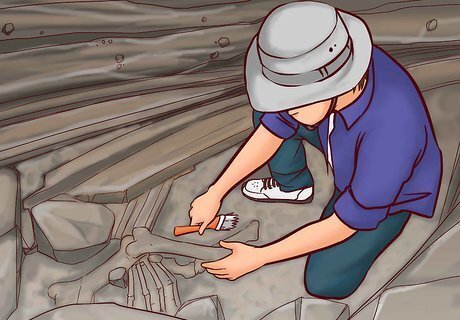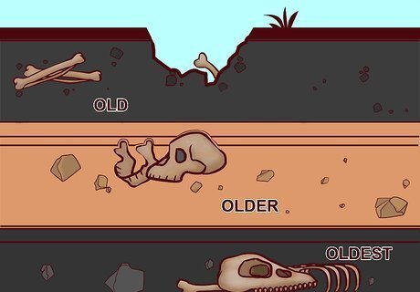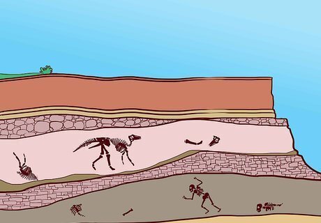 Use the stratigraphy method if the fossils were found on horizontal ground. This method only works if the fossils are not on folded or tilted ground. If you look at a cliff face made from sedimentary rocks, you will notice that there are layers of rocks. These layers are often different colours or made from different textured sediment. The oldest rocks are at the bottom and youngest are found at the top. If a fossil is found in one of the top layers, it can be assumed that it is younger than the fossils and rocks below it. This information can be used for a variety of purposes. For example, if a human skull was found below a dinosaur bone it could indicate that humans predate dinosaurs.