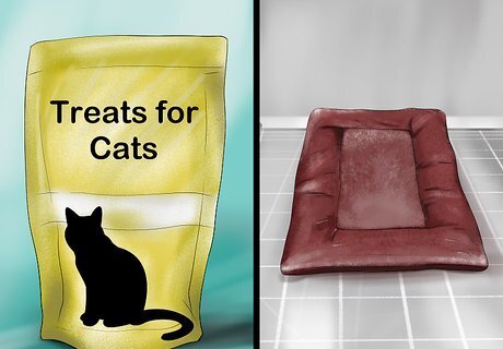 Entice the cat with things it likes. Make sure to bring as many items as you can to entice your cat. This is important, as you’ll want the cat to have a positive association with the car. In addition, by including treats, toys, and more, you may be able to distract your cat from its anxiety and lessen the chance of car sickness. Bring: Treats Toys A bed, towels, and pillows