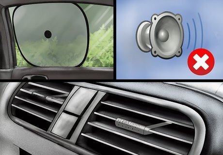 Make the trip as relaxing as possible. By turning the car into a calm and relaxing environment, you’ll settle your cat’s nerves and help it get used to the car ride. In the end, creating a calm environment may help your cat overcome car sickness. Put on white noise. Pull some shades down over the back car windows to darken the back seat. Avoid blaring music. Ask small children to be quiet and calm. Make sure to bring plenty of food and water, especially if you're taking a long trip.