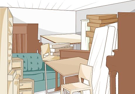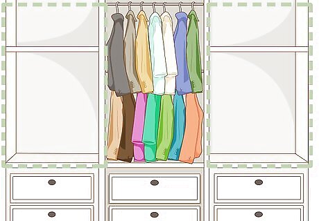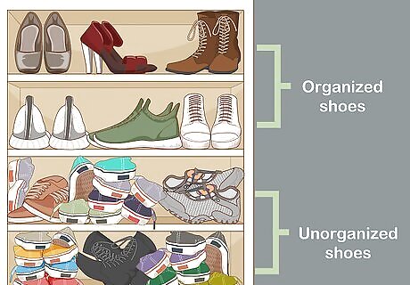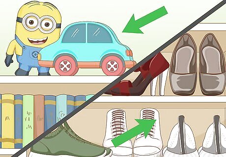 Take advantage of available closet space. Stash larger and lesser used items in a coat closet near the front door. This could include things like sporting equipment, duffel bags or baby carriers that take up too much room elsewhere. Closets are especially useful because they keep your belongings confined to a single space that’s easily accessible and out of sight. Stacking or leaning items on-end can help you fit more into the closet. Don’t forget to check your closet space for things that can be thrown out.