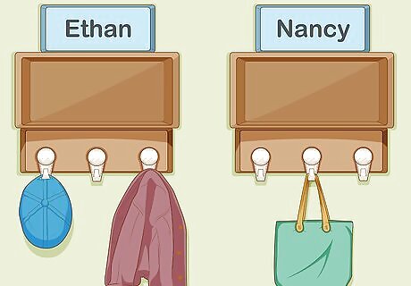 Use your walls. Mount a rack or row of hooks at head height along one wall and use them to hang jackets, backpacks, scarves, hats and other accessories that get put on and taken off frequently. They’ll be plainly visible, which will keep them from getting lost, and won’t obstruct walking space. Attach hooks using removable wall strips to make installation quick and painless and prevent damage. Stick name tags above racks or hooks so that the kids each have a place to leave their things.