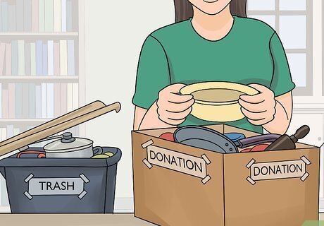 Toss out any old, broken, or unused items from your kitchen drawers. Pull out a trash bag as you examine the contents of your kitchen drawer. Look over each utensil, tool, or other cooking supply to see if it’s broken, moldy, unused, or otherwise past its prime. Throw away these old, unwanted items so you can create more space for more useful utensils and kitchenware. If you have unused items that are in mint condition, consider donating them to a secondhand shop or another charity group.