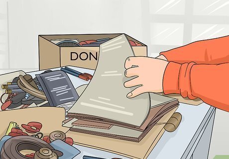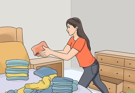 Remove and sort your clothing 1 drawer at a time. Take all of the clothing out of a dresser drawer and set it on a flat surface, like a bedspread or carpet. Separate your clothes by item type, then remove anything you no longer want or need. Thrift and consignment stores are great places to send unwanted clothing. You can also look into local charities near you that collect unwanted clothing.
