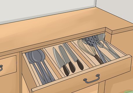 Use drawer dividers to separate your utensils and tools. Take a ruler and measuring tape and figure out the basic dimensions of your kitchen drawers. Look online or in a home goods store to find a storage space that matches those dimensions. Slide or place the divider into your drawer, then use the different partitions to separate and organize your kitchen supplies. For instance, you could place your measuring spoons in 1 section of the drawer, then use another section for your knives and tongs. You could also dedicate a section to your can opener, corkscrew, or meat thermometer.