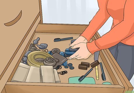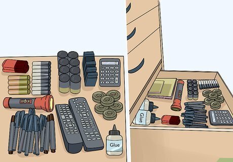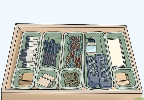 Arrange your most-used items in the front of the drawer. Place your moderately-used items in the middle of the drawer, depending on how often you use them. If you only use certain items on occasion, arrange them in the back of the drawer instead. For example, place your tape in the front of the drawer, while a bag of labels or twist ties might go towards the back.