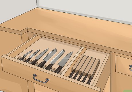 Stack your knives in a drawer instead of using a knife block. Dedicate 1 side or portion of your drawer to your knife collection, as a knife block can take up a lot of valuable counter space. For an extra layer of organization, try sorting the knives by type, like cleavers and serrated blades. You can also dedicate a separate drawer for your utensils.Tip: You can save a lot of space by storing your spices in a separate rack or cabinet.