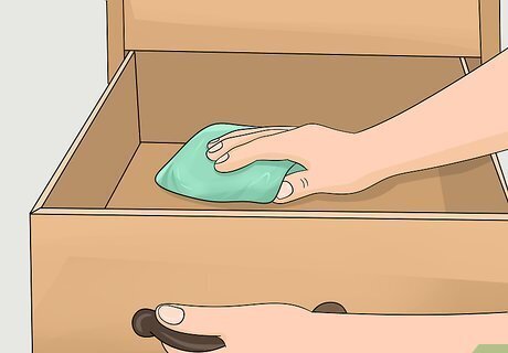 Wipe out each drawer with a dust cloth. Take a clean cloth and wipe down the edges, sides, and bottoms of the drawers. Leave your drawers open for a few minutes so they can air out completely. If your drawers are especially dirty, clean them out with soap and water.