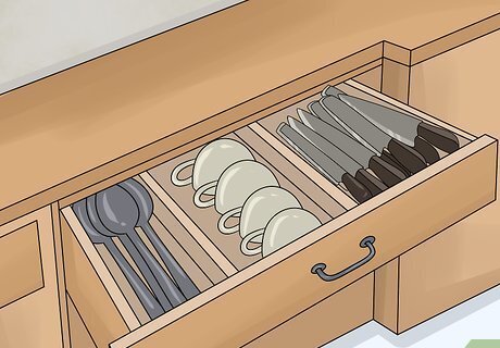 Fill your drawers with items that you use most often. Think about the meals you prepare and other tasks that you normally do while in the kitchen. If you use certain utensils and tools more than others, group those items together in a single drawer. Place the items that you don’t use as much in a separate drawer or cabinet. For instance, if you prepare a lot of meals, place your measuring cups and cutting knives in the same drawer. If you spend a lot of time preparing tea, coffee, or other beverages, put your juicer and tea strainer in the same area.