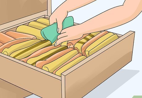 Fold your clothes so they fit in the dresser drawer. Try to make your clothing items look as uniform and compact as possible before placing them in the dresser. Tuck in the sleeves of the fabric so your garments look square-shaped and uniform. Position these shirts upright in the drawer so that they’re side-by-side with one another. This way, you can access and view them easily later on. If you want to take your folding to the next level, try sorting your clothing by color in the drawer!