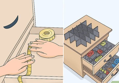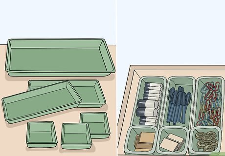 Invest in drawer dividers if you want a long-term solution. Use a measuring tape to determine the length and width of your drawer. With these measurements, look online to find a set of dividers that will fit in your specific drawer. Follow the packaging instructions so you can install the divider or organizer correctly. You can buy many drawer dividers for under $25. For instance, you could place binder clips in 1 compartment, sticky notes in another, and thumbtacks in a separate partition. If you’re organizing a utility drawer, you could keep screwdrivers in 1 section, a tape measure in another, and batteries in another partition.