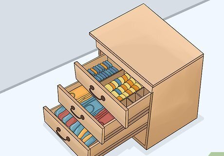 Dedicate certain drawers to specific items of clothing. Don’t mix your socks, tops, and shorts in 1 area! Instead, designate 1 drawer each for your undergarments, tops, bottoms, pajamas, and so forth. For instance, if your dresser has 3 drawers, dedicate the top section to undergarments and socks, the middle section to shirts and tops, and bottom section to pants and bottoms.Tip: Invest in dividers or bins if you’re storing small garments like socks or underwear.