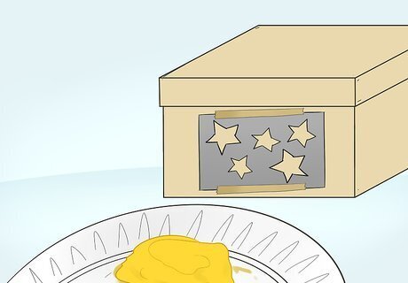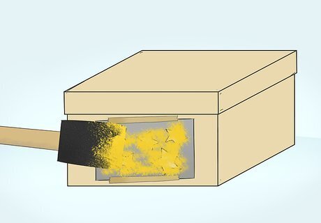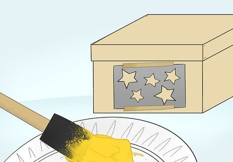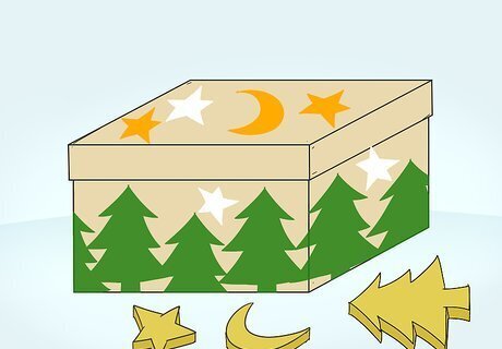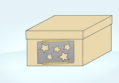 Stamp designs onto the box using rubber stamps and an ink pad. You can use regular rubber stamps and an ink pad. You can also cut your own stamps out of thin sponges and use tempera paint for the ink. Try using different sized stamps. For example, use the larger stamps (such as trees) towards the bottom, and smaller stamps (such as stars) towards the top. Consider using different colors of ink or paint.