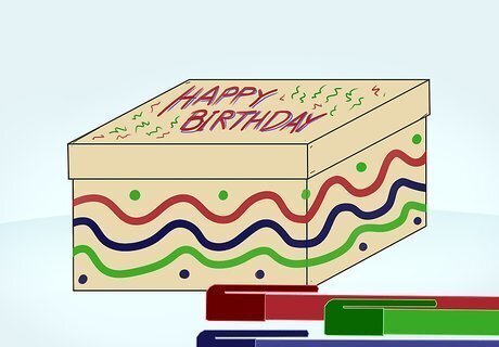 Use a permanent marker or a paint pen to add writing or designs onto your box. Permanent markers are cheaper and easier to use, but paint pens are more opaque and will show up against patterns and dark colors. You can write simple messages, such as "Happy Birthday" or "Love." You can also draw random designs, such as hearts, spirals, and swirls. Here are some ideas: If the gift box is for a birthday present, use bright colors (or the receiver's favorite colors). Write "Happy Birthday" all over the box. Consider drawing some balloons, tiny stars or confetti, and spirals. If the box is for a holiday, use colors and symbols that match the holiday. For example, if the gift box is for Halloween, use orange and black for the colors. Draw some pumpkins, black cats, or bats.