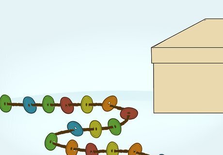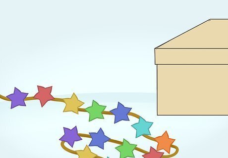 Make a garland out of twine and colorful buttons. Find some buttons that have two or four holes in them; the cheap, craft buttons that come in a bucket at great for this. Then, cut a piece of twine long enough to wrap around your box a few times. Weave the twine through the holes in the buttons until you have as many buttons as you want on your twine. Tie a knot at each of the twine, then tie the twine around your box like you would with a ribbon. This is great for a rustic gift of a baby shower. Here are some color ideas: For a rustic gift, choose a brown piece of twine. Use buttons in random colors and sizes. For a gift for a baby girl, use a pink piece of twine. You can use all pink buttons, or alternate pink and white buttons. For a baby boy, use a light blue piece of twine. You can use all light blue buttons, or alternate them with white buttons.