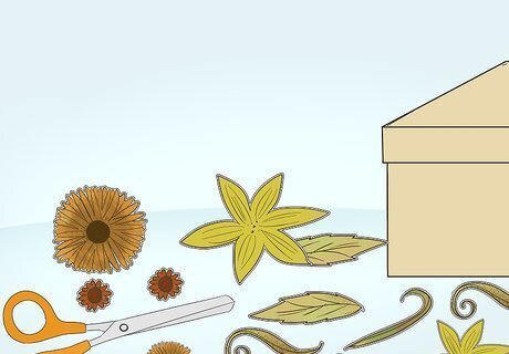 Glue down some scrapbooking embellishments onto the lid. You can find them in the sticker or scrapbooking section of an arts and crafts store. Find some colorful paper flowers, butterflies, and leaves in different sizes and glue them down in a small patch on the lid. Try to the largest shapes in the center of the patch, and the smaller designs on the sides. Give the patch an asymmetric shape to make it more interesting. You don't need a lot of shapes to make this look beautiful, but you might want to use fewer large shapes and more of the smaller ones. Consider working in odd numbers, instead of even. For example, you could have three large shapes, and five to seven smaller ones.