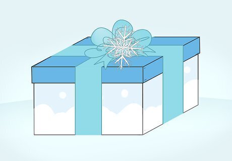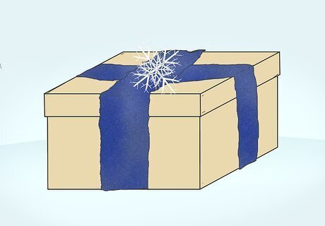 Add some embellishments to the ribbon. After you have placed the gift inside the box and tied a ribbon, tuck some embellishments just behind the ribbon. Try to match the embellishments to the theme of the event. If necessary, secure the embellishment with hot glue or clear tape. For example, if the box is for a Christmas gift, you could do any of the following: If the box has a blue or winter theme, loop a silver or white glittery snowflake around the ribbon. If the box has a more rustic feel to it, snip a small branch off of your Christmas tree and tuck it behind the bow. You can also use a cinnamon stick instead. If the box has a more traditional feel to it, you could tuck a small pine branch behind the bow, and add a tiny glass ornament; the ornament shouldn't be larger than 1 inch (2.54 centimeters) or so in diameter. For a sweet tooth, you might want to stick a candy cane behind the bow. If you want to add a more festive touch, look a jingle bell ornament over the top of the candy cane.