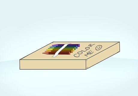 Keep kids and doodlers happy by taping some crayons to the lid of a blank box. A blank box may be someone else's canvas. Take five or six crayons in basic colors (red, orange, yellow, green, blue, and purple), and tape them side by side in a neat row in the corner of the lid. Write the words "Color Me" next to the crayons. You can also cut down some coloring book pages so that the fit each side of the box, and glue them to the box. Tape the crayons to the top corner of the box. This will give your little artist something to color once the event is over.