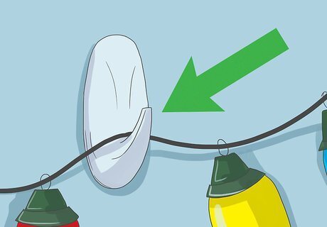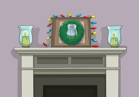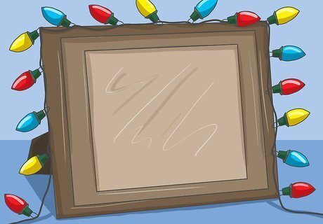 Wrap your frame in Christmas lights. Wrap the picture frame entirely with your Christmas lights, but leave enough of the string to either side of the frame so the lights can extend to both edges of the mantel. Excess length can be draped down the mantel sides. Make sure you leave enough length to connect your lights to a power outlet. You may have to use an extension cord. Your lights, if tightly wrapped, may stay in place without a fastener. However, to ensure your lights remain in place, you may want to attach them with a few pieces of clear tape.