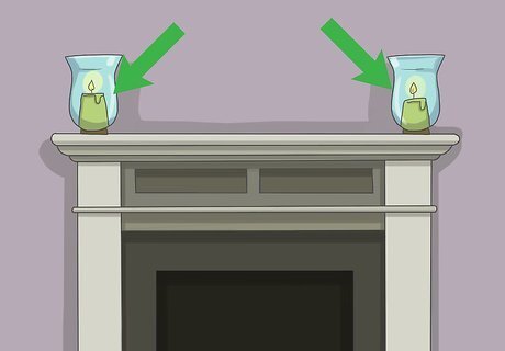 Place your hurricane lamps on either side of your mantel. If you don't intend to light the candles in your hurricane lamps, you may want to add a pop of color to the lamps. Do this by bending and coiling evergreen cuttings around the bottom of the inside of the lamp. To prevent potential fires but to add a soft ambiance to your mantel decorations, you might want to put some LED candles in your hurricane lamps. Remember that you can use similarly heavy Christmas themed decorations, like large Christmas figurines, trains, nutcrackers, and snow globes, in place of hurricane lamps.