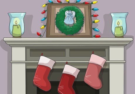 Hang your stockings from the mantel and enjoy. You may be able to hang your stockings from the decorations holding your decorative frame in place, but you could use adhesive hooks. Hide these behind decorations, like lights, decorative pine cones, trains, snow globes, and so on, then hang the stockings from the hooks.