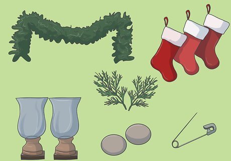 Gather your supplies. Most of these supplies can be found at craft stores or general retailers, with the exception of the hurricane lamps. Any heavy and suitably themed decorative mantle piece can be used in place of the hurricane lamps, which are intended to hold your garland in place. You'll need: Christmas garland (long enough to drape across your mantel) Christmas stockings Evergreen cuttings (optional) Hurricane lamps (or large, sturdy candles) Paperweights (equal in number to stockings) Safety pins