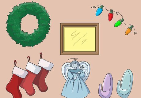 Collect your materials. It shouldn't be too hard to find most of these materials at a craft store or general retailer. However, if you don't have a spare picture frame on hand, you can usually purchase one inexpensively at thrift and secondhand stores. You'll need: Adhesive hooks (several) Angel ornament Christmas lights Christmas stockings Christmas wreath (small size) Fishing line (or similar transparent line) Picture frame (large size; empty) Tape (optional; clear kind preferred)