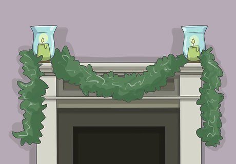 Drape your garland over the mantel. Drape your garland across the mantel so it runs behind your hurricane lamps. Arrange the garland so that its excess length hangs equally on both sides of the mantle. Avoid pulling on the garland after it has been strung behind the lamps. Doing so could knock your lamps on the floor. Some garlands come decorated with red berries and leaves to add color. If yours did not, you can add plastic berries and leaves to your garland with small safety pins. Glue pinecones onto to the garland to give it a more natural look. Spray fake snow or glitter onto the garland to make it more festive.