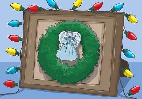 Decorate your frame. Take an adhesive hook and attach it to the top-center of the frame. From this hook, hang your angel ornament on a long piece of fishing wire so the angel hangs in the center of the frame. Then, add your small wreath to the same hook to hide the hook from view. You can hang any decoration or ornament you desire from the center of your frame. Put Christmas-themed materials inside the frame, such as wrapping paper, Christmas cards, or winter calendar photos.