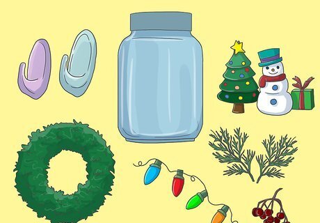 Assemble your decorations. Most of the things you'll need for this project can be bought at your local craft store or a general retailer. When choosing jars, a wide assortment can add a unique flair to your mantel display, though even mason jars should do in a pinch. You'll need: Small Christmas tree Adhesive hooks (x3) Assorted jars Assorted knickknacks (like Christmas figurines, ornaments, etc.) Christmas lights Christmas wreath Evergreen cuttings Glass cleaner (optional) String of ornamental cranberries