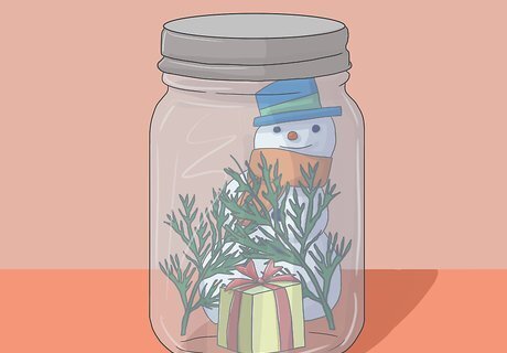 Add decorations to your jars. Take thin, light evergreen trimmings and place them in your jars. Or, you may want to alternate between evergreen sprigs, decorative pine cones, and Christmas figurines in your jars. You could even fill some jars with tinsel to add some sparkle to the scene. Avoid putting anything too top heavy into your jars, as that could result in the jar becoming unbalanced and falling from the mantel. Put small bulbs or fake berries in the jars to add a pop of color to your decoration.