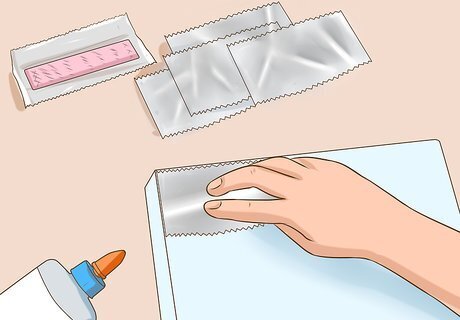 Make a metallic gum wrapper cover. Ever notice how chewing gum usually comes in a shiny foil wrapper? If you have a lot of these wrappers lying around, you can use them to give your binder a cool metallic sheen. Gently flatten the gum wrappers and stick them to your binder cover (or the binder itself) with a small amount of glue. Repeat until the whole surface is covered. Voila—a metallic binder. If you're having a hard time getting the wrappers perfectly smooth, try rubbing them with a coin or the front of your fingernail to smooth them out. You can also use clear packing tape here as well to put a clear protective layer over your wrappers.