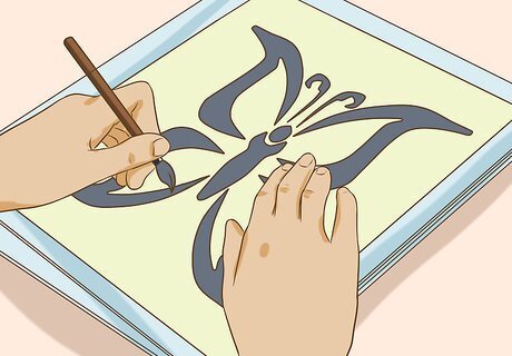 Use stencils to create awesome designs. Don't have the time to make your own drawing or painting freehand? Just use a stencil! Stencils make it easy to add good-looking designs to your binder cover in just a few seconds. You can trace the outlines of stencils or fill them in — it's up to you. If you're using paint, tape your stencil down so that it's tight against your binder cover before you start. Apply your paint sparingly. If your stencil isn't tight or you use too much paint, paint can leak under the edges and leave you with a messy design. You can make your own stencils, too — just print pictures and carefully cut around the edges with a pair of scissors or craft knife.