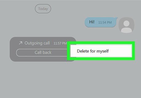 Select Delete for myself on the right-click menu. This will delete the selected call log. The gray box with your call's length and time information will disappear from the conversation. Deleted call logs will still show up on your contact's account. You can only delete a call log from your own phone or computer.