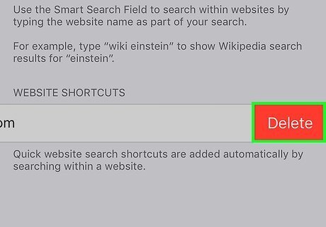 Tap Delete. Safari will remove the website from the shortcuts. It will no longer search the website directly when you type into the browser’s address bar. However, the website may still appear in the search engine's results.