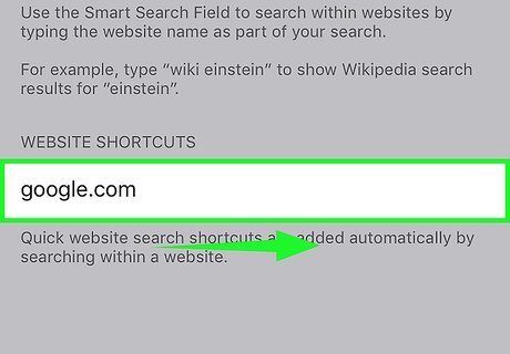 Swipe left on the desired website. The list of website shortcuts is located below the main Quick Website Search toggle. A red Delete button appear to the right of the website’s name.