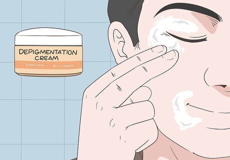 Use depigmentation cream if much of your face is discolored. Sometimes it can help to lighten the darker areas of your skin so your face has an even complexion. Apply a depigmentation cream prescribed by your doctor to the darker areas of your face to lighten them and help them blend in with your vitiligo patches. Ask your doctor if depigmentation is safe for you to use and if they’ll prescribe a cream for you. Depigmentation is permanent and can cause redness, itchiness, and swelling when you use it. It can take many months of application to achieve an even complexion.