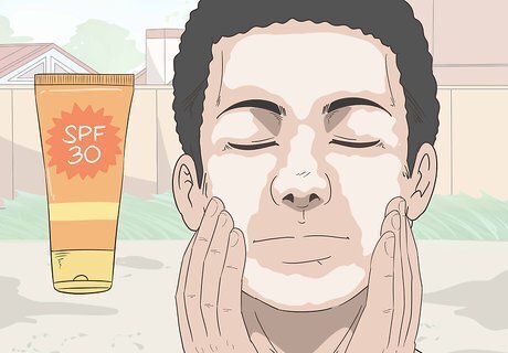Put sunscreen on your face before you go outside. The patches of vitiligo on your face can burn easily if it’s exposed to the ultraviolet radiation in sunlight for too long. Damage to the skin on your face, such as a bad sunburn, can make your vitiligo worse. Before you head outside, put some sunscreen on your face and rub it in for even coverage. Make sure the sunscreen has both UVA and UVB protection or “broad spectrum” coverage. Check the label to make sure. Use sunscreen with an SPF of 30 or higher for better protection.Tip: If you’re spending an extended period of time outside, apply sunscreen every 2 hours. Apply more sunscreen if you go swimming or if you sweat off your original application.