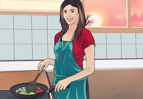Cook. Eating out or buying prepared foods is convenient, fast, and easy. But it also means that you can't control how your food is prepared or what ingredients are used. One of the most effective ways to lose weight is to cook your meals at home. You can choose healthy cooking methods (e.g. baking instead of frying) and fresh ingredients. Plan your meals in advance. By making a weekly menu, you will be less likely to go off track and call for take-out midweek. You can make things easier on yourself by preparing healthy meals to keep in the freezer and eat as needed. Make cooking fun. Treat yourself to a new set of knives or a cute apron. These sorts of things can give you the motivation you need to spend more time in the kitchen.