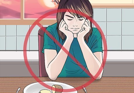 Don't skip meals. You may be tempted to try and boost your weight loss by skipping meals, or you may simply get so busy or distracted that you forget to eat. Whatever the reason, skipping meals only serves to sabotage your diet. It may cause you to overeat later in the day or it may cause your body to cling to fat and slow down your metabolism. Aim for three meals with one to two snacks every day or four to six small meals.