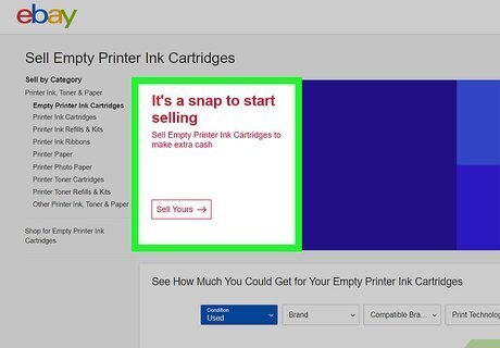 Put your empty cartridges on eBay to auction them off. If your cartridge isn’t particularly old, many people online will be interested in buying and refilling it for personal use. Find the manufacturer and model printed on your toner cartridge and take a photo. Post the information on eBay and list the type of printer that it is used in. Wait for an individual buyer to purchase your cartridge and ship it to the buyer to sell your cartridge for a reasonable sum of moneys.Tip: Used cartridges typically sell for $10-30 depending on the model of the printer and cartridge. New toner cartridges can be quite expensive. Many people choose to refurbish and reuse old cartridges that they buy online to save money. Even if your cartridge can’t be refilled, there are kits that people use to drill holes in cartridges and refill them before sealing the hole.