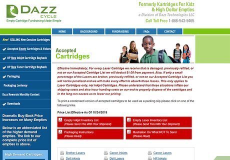 Find a buy-back program and ship your cartridges to them. There are many recycling programs that will purchase your cartridges from you. Look online to find a buy-back site and print a label through their website. Put your cartridge in a plastic bag and take it to the post office to ship it to the buy-back program. They will send you a check or credit your account with their company with money. Popular buy-back programs include Dazz Cycle (http://www.dazz-cycle.com/sell-used-ink-cartridges.asp), Ink Recycling (https://www.inkrecycling.org/), and Fundraiser Factory (http://www.fundingfactory.com/).