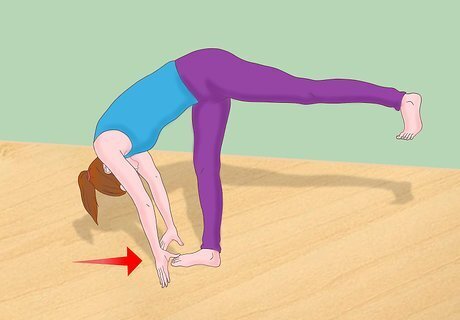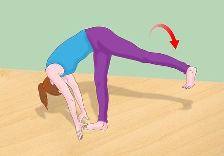 Grab the ankle of your standing leg. A final variation, that will deepen the stretch, just involves you reaching around and grabbing he ankle of your standing leg with the opposite hand when you are in a Standing Split. This variation requires a lot of balance and composure, so be sure you are breathing with a nice, steady rhythm and completely in control before you attempt it.