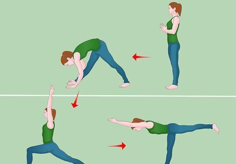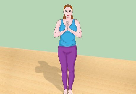 Do a quick yoga sequence to prepare. Before you move onto the standing splits, you should do a short yoga sequence to ensure that your body is fully prepared. This will help you stretch out your muscles and relax your mind. Sun salutations A and B are both cited as excellent ways to prepare for standing splits. You could also move through the following poses: Start in mountain pose. Stand up straight with your hands in prayer position in front of your chest. Then move into Parsvottanasana (Intense Side Stretch Pose). From mountain pose step your left leg back and turn your left foot out around 30 degrees. Then carefully tilt forward at the hips and bring your hands forwards and down towards your right foot. From this position you can move into High Lunge by bending your right knee and dropping your hips as you lean back and raise both your arms above your head. You can then move into Warrior III. Stand and bring your feet back together and then raise your right leg behind you. Tilt your body forwards and ahead of your standing foot.