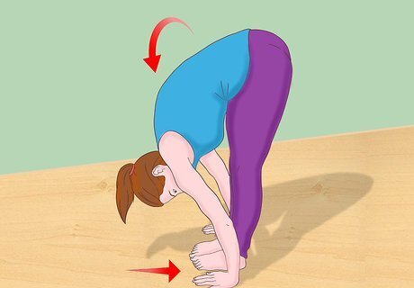 Move into Standing Forward Fold. Inhale and raise both your arms up over your head. Pause and then exhale. As you breathe out, bend at your hips and reach your hands down towards the floor to bring you into Standing Forward Fold. Straighten your legs but do not lock your knees. Bring your hands down so that they are flat on the ground. If you cannot place your hands comfortably on the floor, you can place a yoga block beneath each one. You should feel a stretch, but not be in pain.