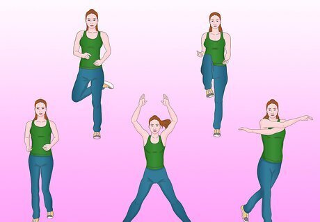 Do a light cardio warm-up. Standing splits are a difficult pose, so you need your body to be well-prepared for before attempting. It’s important to stretch out and engage your muscles, but you can start by doing a light cardio warm-up to get the blood flowing and your heart pumping. Do a quick dynamic warm-up for around five minutes. This could include the following exercises: Light jogging on the spot. Leg swings and arm swings. Butt kickers. High knees. Jumping jacks. Squats.